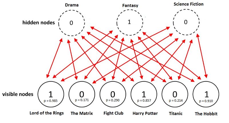 在这个例子中,只有表示类型奇幻的隐藏神经元被激活。给定这些电影评分,受限玻尔兹曼机能够正确识别用户最喜欢奇幻类型的电影。