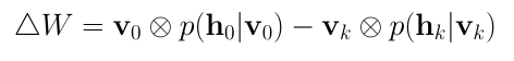 在对比发散(Contrastive Divergence)这一步骤中,模型更新权重矩阵。使用向量v0和vk计算隐藏值h0和hk的激活概率。这些概率的外积和输入向量v0、vk的差别为更新矩阵(update matrix):