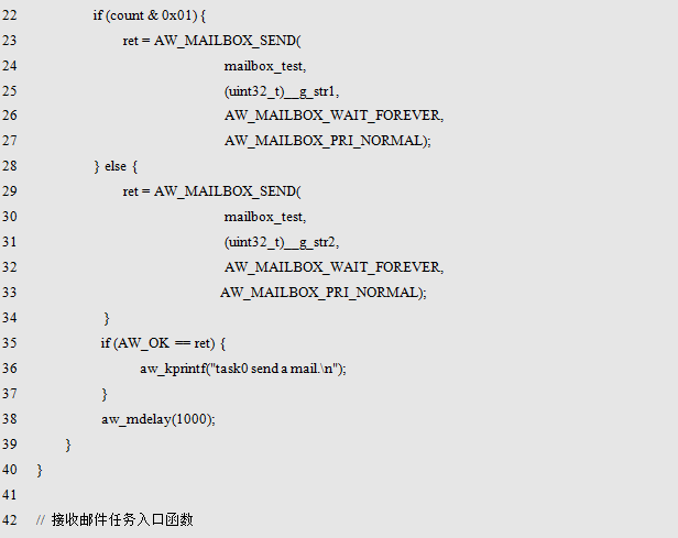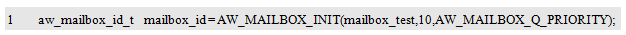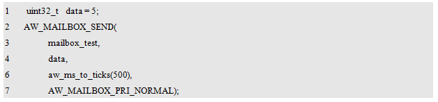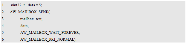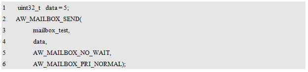 AW_MAILBOX_INIT()用于初始化一个邮箱实体,初始化完毕后,将返回该消邮箱的ID,其类型为aw_mailbox_id_t。定义一个该类型的变量保存返回的ID如下:
