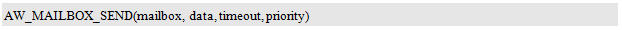 注意,priority参数指定了消息的优先级,其可能的取值有两个:AW_MAILBOX_PRI_NORMAL和AW_MAILBOX_PRI_URGENT,分别表示普通优先级和紧急优先级。一般地,均使用普通优先级,此时,新的消息按照先进先出的原则,依次排队存入邮箱,该消息将后于当前邮箱中其它消息被取出。若使用紧急优先级,则新的消息插队放在邮箱的最前面,该消息将先于当前邮箱中其它消息被取出,即在下次从邮箱中获取消息时被取出。
