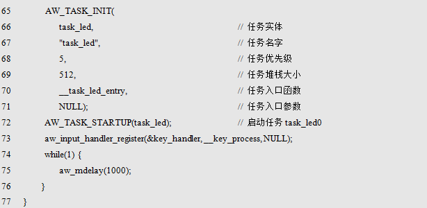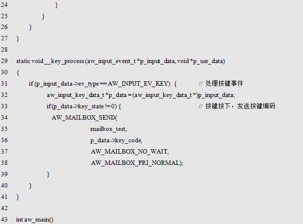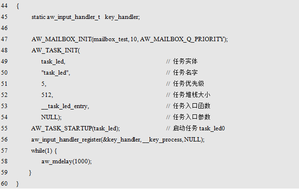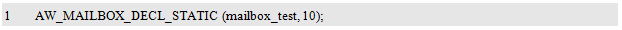 AW_MAILBOX_DECL_STATIC() 在定义邮箱所需内存时, 使用了关键字static ,如此一来, 便可以将邮箱实体的作用域限制在模块内(文件内), 从而避免模块之间的邮箱命名冲突,同时,还可以在函数内使用本宏定义邮箱实体。