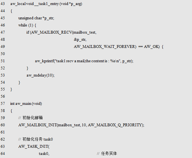 如使用AW_MAILBOX_DECL()定义一个标识名为mailbox_test的邮箱实体,邮件的最大数目为10,其范例程序详见程序清单10.49。