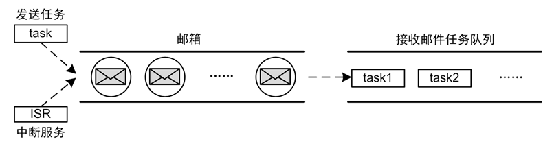 当邮箱中存在多封邮件时,默认按照先进先出(FIFO)的原则传递给接收邮件的任务。邮件的大小固定为4字节,当需要传递的消息内容大于4字节时,则可以仅将消息的地址作为邮件内容,任务接收到邮件时,通过该地址即可查找到相应的消息。这种方式使得使用邮箱进行消息传递的效率非常高。