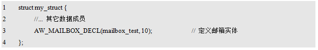 使用AW_MAILBOX_DECL()定义邮箱实体时,可以将邮箱的实体嵌入到另一个数据结构中,其范例程序程序清单10.50。