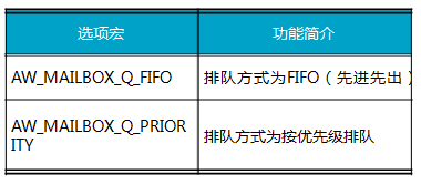 其中,mailbox为由AW_MAILBOX_DECL() 或 AW_MAILBOX_DECL_STATIC()定义的邮箱。mail_num表示邮箱可以存储的邮件条数,其值必须与定义邮箱实体时的mail_num相同。options为邮箱的选项,其决定了阻塞于此邮箱(等待消息中)的任务的排队方式,可以按照任务优先级或先进先出的顺序排队,它们对应的宏详见表10.8。