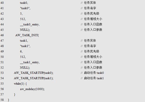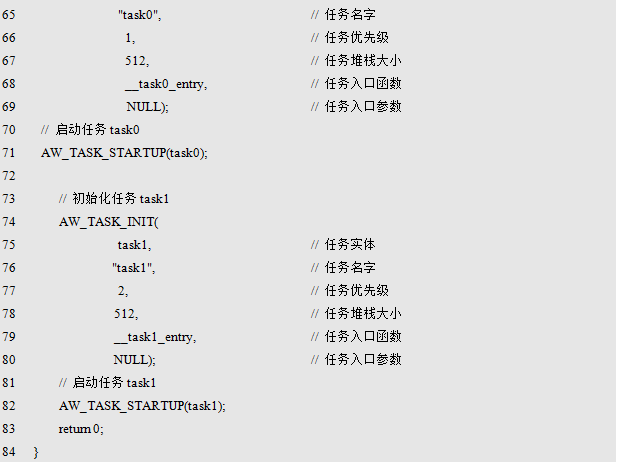 "The count is an even number!"。显然,字符串的长度超过了4个字节,因此,两个数组的大小也都超过了4字节。在tsak1发送消息时,将字符串数组的地址作为消息发送到了邮箱中。task1用于接收消息,当接收到消息时,将其作为字符数组的地址,使用aw_kprintf()将接收到的字符信息打印出来。以此完成了消息的传递。
