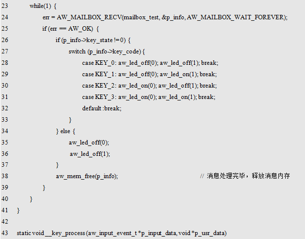AW_MAILBOX_WAIT_FOREVER。则任务会阻塞于此,一直等待,直到邮箱中有可用的消息,即其它任务或中断发送了消息。范例程序详见程序清单10.53。