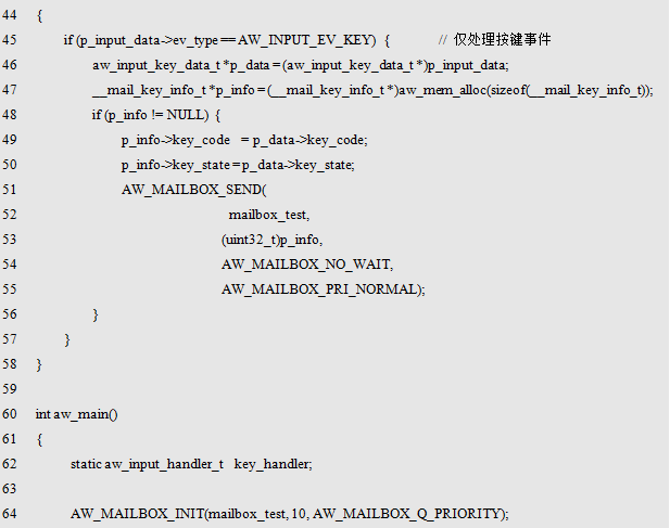 也可以使用AW_MAILBOX_DECL_STATIC()定义一个标识名为mailbox_test的邮箱实体,其范例程序详见程序清单10.51。