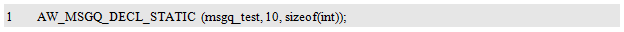 两个宏的区别在于,AW_MSGQ_DECL_STATIC() 在定义消息队列所需内存时, 使用了关键字static ,如此一来, 便可以将消息队列实体的作用域限制在模块内(文件内), 从而避免模块之间的消息队列命名冲突,同时,还可以在函数内使用本宏定义消息队列实体。