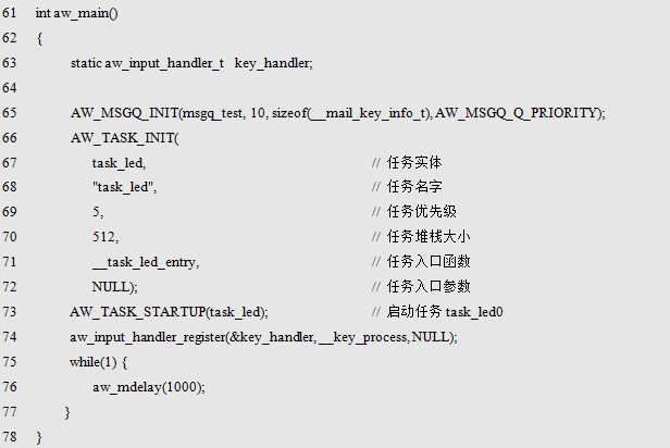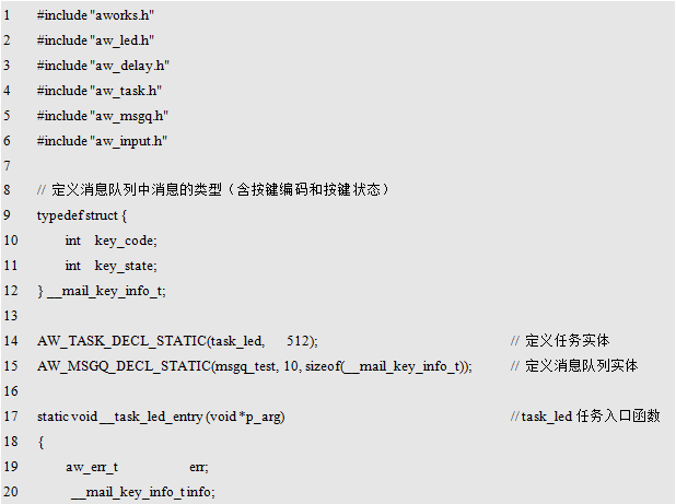 也可以使用AW_MSGQ_DECL_STATIC()定义一个标识名为msgq_test的消息队列实体,其范例程序详见程序清单10.66。