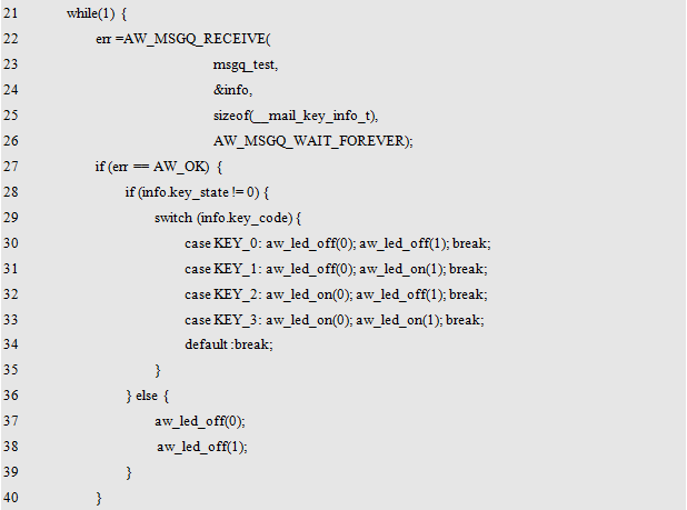(2)若timeout的值为AW_MSGQ_NO_WAIT。则任务不会被阻塞,立即返回,但不会成功获取到消息,此时,AW_MSGQ_RECEIVE()的返回值为:-AW_EAGAIN(表示当前资源无效,需要重试)。范例程序详见程序清单10.69。