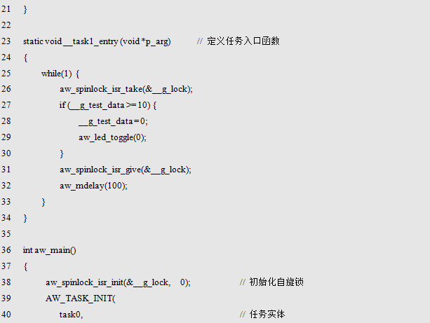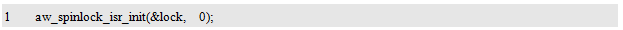 在使用自旋锁前,必须先使用aw_spinlock_isr_t类型定义自旋锁实体,该类型在aw_spinlock.h中定义,具体类型的定义用户无需关心,仅需使用该类型定义自旋锁实体,即: