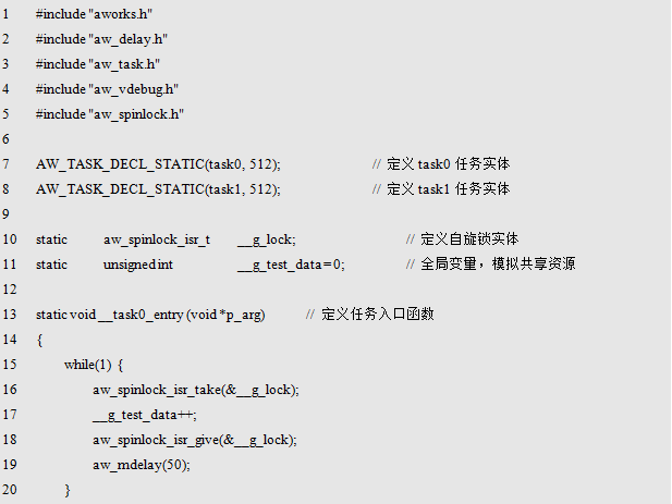 由于两个任务均需对全局变量进行操作,为了避免冲突,需要两个任务互斥访问该全局变量,显然,加值操作是非常快的,占用时间极短,可以使用自旋锁实现互斥访问,范例程序详见程序清单10.79。