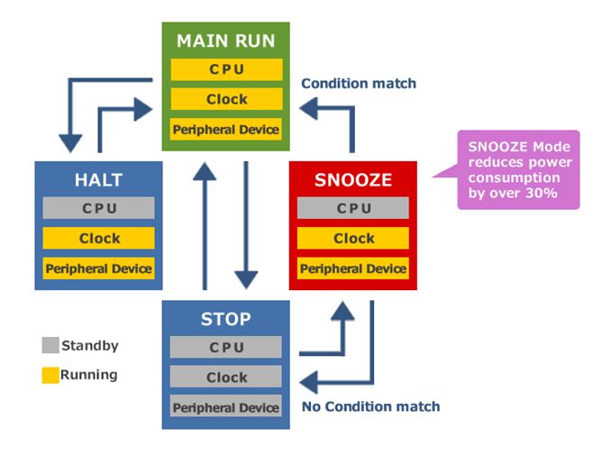 RL78家族微控制器具有多种低功耗模式,可以满足不同应用需求。其三种低功耗模式(包括HALT、SNOOZE、STOP),可以通过禁用空闲CPU功能来最大限度地延长电池寿命。