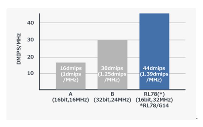 RL78家族产品采用了RL78高性能内核,其中RL78 / G14微控制器在32MHz下可提供高达44 DMIPS的性能,具有无与伦比的功耗/性能比(功耗仅为竞争对手的1/3),与现在流行的32位微控制器竞争对手的技术相比,DMIPS评级更高,功耗更低。