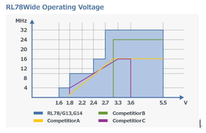RL78可提供1.6 V至5.5 V的工作电压,再同类产品中属于最宽电压。得益于高性能内核,RL78微控制器中85%的指令可在一个时钟周期内执行。