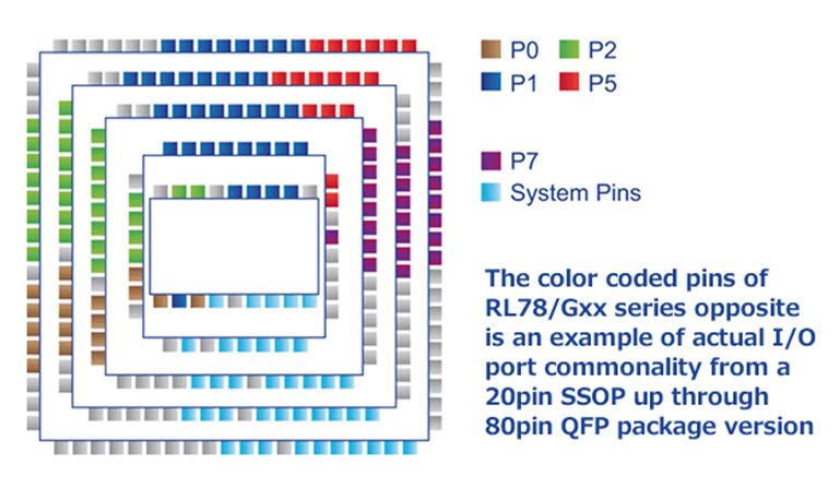 RL78 系列微控制器提供全面的引脚兼容性,可以轻松迁移到更多的引脚数量的其他型号微控制器,并添加额外的I / O和功能。从20~128引脚的微控制器,其封装引脚的PCB布局具有相同的顺序/位置,而且软件代码可以在整个RL78家族产品中重复使用。