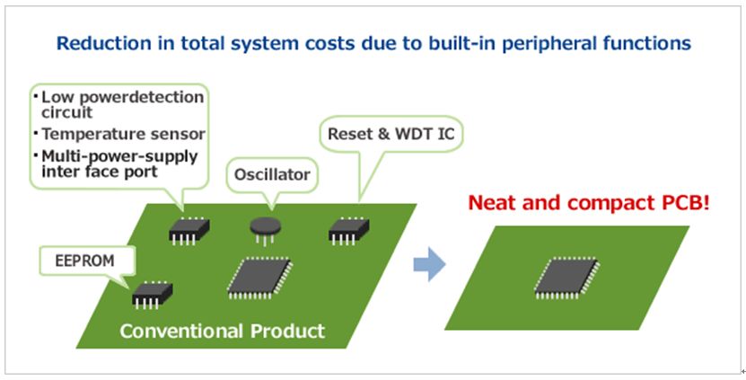 RL78家族微控制器内置了各种特殊功能,如片上复位电路、低电压检测电路、看门狗定时器、高精度(1%)片上振荡器、数据Flash、温度感应器、20mA端口驱动电流、电压调节电路等。这些功能不仅可以减少产品PCB上面的元器件数量,还可以减少不必要的硬件设计时间,从而缩短开发周期和缩减系统成本。
