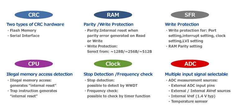 RL78家族微控制器具有广泛的安全特性,具有CRC硬件、RAM写保护、SFR写保护、非法内存访问检测、时钟频率检测和ADC多路自检等功能,这些安全硬件功能都符合IEC / UL 60730标准。