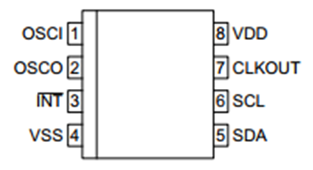 PCF85063是NXP半导体公司推出的一款低功耗实时时钟/日历芯片,它提供了实时时间的设置与获取、闹钟、可编程时钟输出、定时器/报警/半分钟/分钟中断输出等功能。引脚封装详见图13.3,其中,SCL和SDA为I2C接口引脚,VDD和VSS分别为电源和地;OSCI和OSCO为32.768KHz的晶振连接引脚,作为PCF85063的时钟源;CLKOUT为时钟信号输出,供其它外部电路使用;INT为中断引脚,主要用于闹钟等功能。