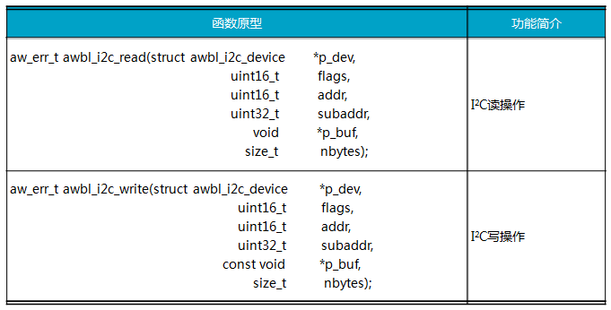 在通用I²C读写接口中,除p_dev外,仅subaddr、p_buf和nbytes三个参数,分别表示寄存器子地址、读/写数据缓存、读/写数据字节数。而这里的读写接口多了flags和addr两个参数,分别表示从机设备属性和从机设备地址,实际上,通用I²C接口也有这两个信息,不过是在使用aw_i2c_mkdev()定义从机设备时,存储在了从机设备中,对于通用I²C接口,这两个信息在aw_i2c_mkdev()接口中指定。本质上,它们表示的含义是完全相同的。
