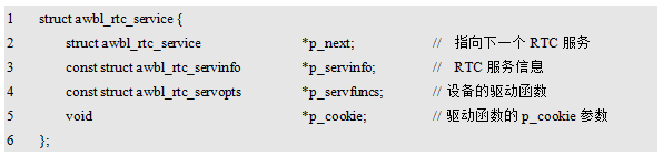 其中,p_next用于指向下一个RTC服务,使系统可以以链表的形式组织多个RTC服务。p_servinfo为RTC服务相关的信息,提供RTC服务时,必须指定RTC服务的信息,其类型struct awbl_rtc_servinfo的定义详见程序清单13.56。