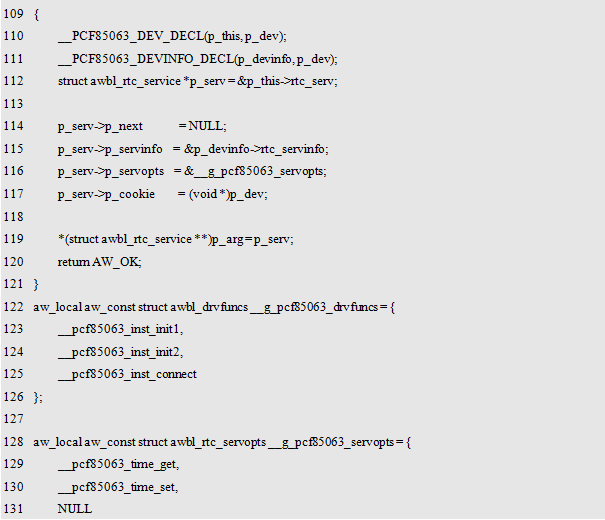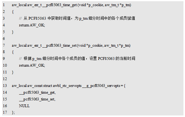 p_servfuncs指向一个虚函数表,其类型struct awbl_rtc_servopts包含了RTC服务定义的抽象方法,详见程序清单13.57。