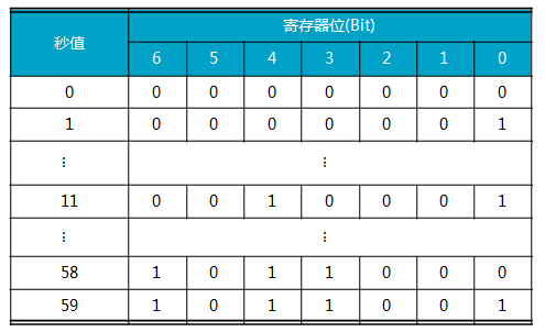 注意,在寄存器中,数值的存储形式是BCD格式,即数值的十位和个位分别使用4位二进制数(一位十六进制数)进行表示。例如,秒值为23,则十位2使用4位二进制表示,即0010,个位3使用4位二进制表示,即0011,最终的结果即为0010 0011。对于秒值,由于十位的最大值为5,需要使用3位二进制表示,因此,秒值占用的实际有效位为7位(十位占用3位,个位占用4位)。不同秒值对应的寄存器值详见表13.11。