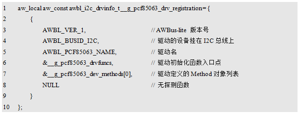 确定驱动所处的总线类型,对PCF85063作简要了解可知,该芯片通过I²C总线访问,芯片所处总线的类型即为:AWBL_BUSID_I²C。总线类型是一个非常重要的信息,驱动结构体常量、设备类型的定义均与总线类型相关。