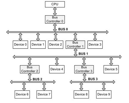 一些外围器件可能又是总线控制器,则其又可以扩展出一条总线,比如SC18IS602B,其为I²C转SPI芯片,可以扩展出SPI总线,在SPI总线上,又可以挂在其它SPI接口的器件,比如:SC16IS752(一款SPI转UART芯片,仅用作拓扑结构展示,用户无需了解具体细节)。特别地,若连接的芯片又是一个总线控制器,则可以继续扩展总线,从理论上讲,通过添加总线控制器,可以将系统的总线层次无限地增加,即系统的功能外设可无限扩展。