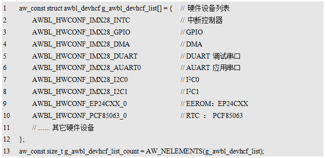 程序清单12.1 硬件设备列表(awbus_lite_hwconf_usrcfg.c)
