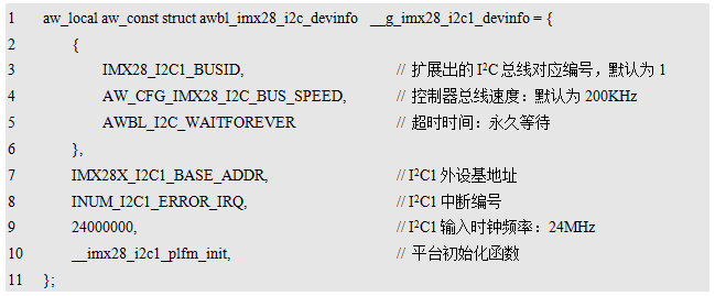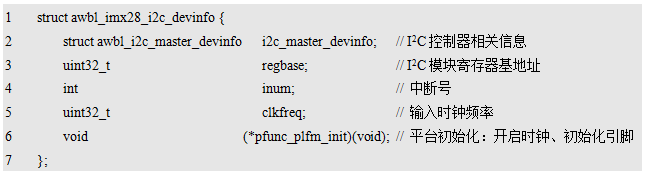 其中,__imx28_i2c1_plfm_init为实现的平台初始化函数,其可直接作为设备信息中