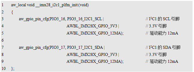 pfunc_plfm_init是一个函数指针,指向一个无参数、无返回值的平台初始化函数,用于完成平台相关的初始化操作,比如引脚配置等。例如,在定义一个平台初始化函数,完成I²C1设备的SCL和SDA引脚配置,详见详见程序清单12.5。