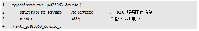 对于PCF85063设备,在其对应的驱动头文件awbl_pcf85063.h中定义了PCF85063的设备信息类型为awbl_pcf85063_devinfo_t,其具体定义详见程序清单12.7。