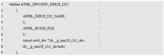 例如,i.MX28x的片上I²C设备驱动,其对应的驱动头文件为:awbl_imx28_i2c.h,在该文件中,定义了驱动名为AWBL_IMX28_I²C_NAME,完整定义如下: