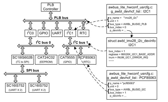 AWBL_BUSID_I²C,即PCF85063挂在某一I²C总线上,显然,I²C总线需要由I²C总线控制器设备产生,比如在i.MX28x中,片上外设I²C0和I²C1均可以产生I²C总线。