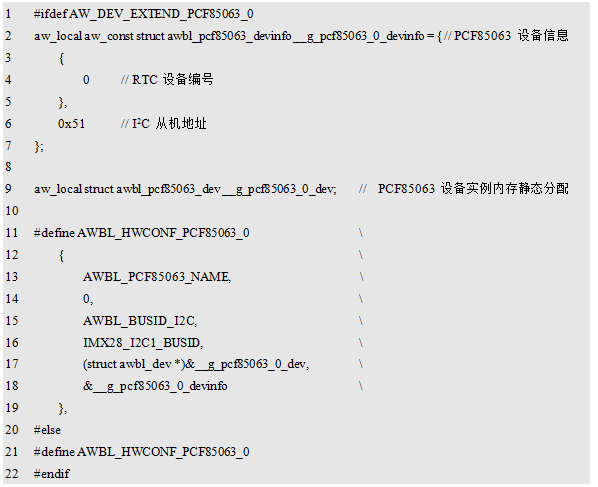 由此可见,只要PCF85063设备被使能,AW_DRV_AWBL_EXTEND_PCF85063_0宏将被自动定义,使相应的驱动也随之注册到系统之中。