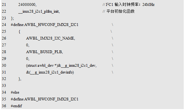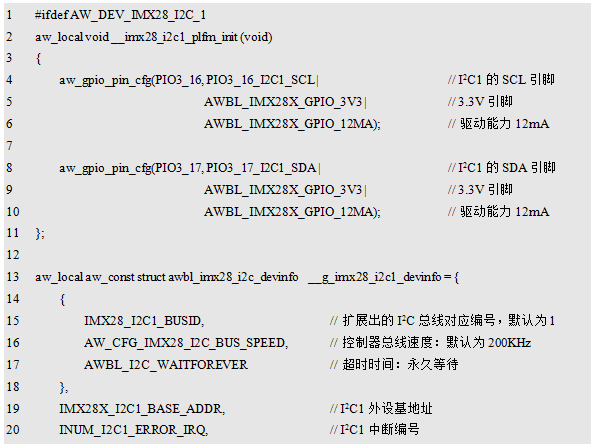 程序清单12.17 I²C0设备信息配置(awbl_hwconf_imx28_i2c0.h)