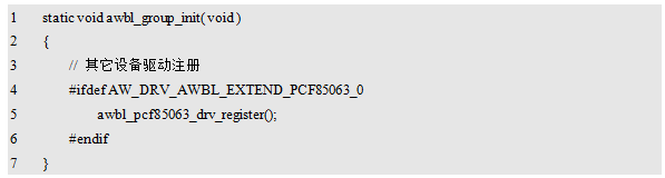 每个驱动都提供了一个驱动注册函数,要使用该驱动,则应在awbl_group_init()函数中调用驱动提供的注册函数。例如,对于PCF85063设备驱动,其提供的驱动注册函数在驱动头文件awbl_pcf85063.h文件中声明,即: