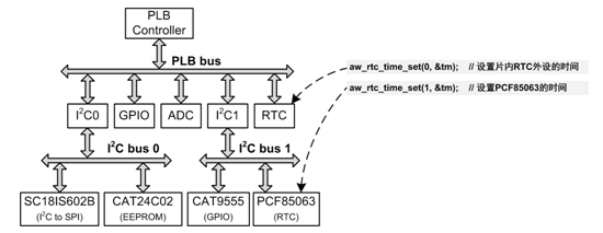 无论硬件设备挂在何种总线上,处在AWbus-lite拓扑结构中的何种位置,对同一类硬件设备,均可使用相同的接口对它们进行访问。例如,在一个基于i.MX28x的系统中,使用了两个RTC设备:i.MX28x 片上RTC外设,外围器件PCF85063。它们的编号分别为0、1,使用通用接口对它们进行访问的示意图详见图12.5。