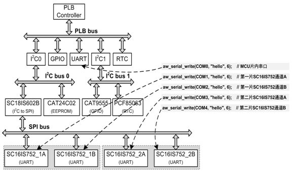 在图12.6中,总共有5个串口:MCU片内有1个串口,两片SC16IS752外扩了4个串口,它们的串口号分别为COM0、COM1、COM2、COM3和COM4。在实际硬件连接中,访问SC16IS752芯片需要经过PLB总线、I²C总线和SPI总线,进而使用其中的UART功能,但对于用户来讲,同样只需要简单的调用串行通用接口即可使用SC16IS752芯片提供的串口功能,和使用片内的UART外设并无区别。
