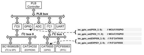 为了使用统一的拓扑结构描述所有的片外和片内外设,在AWBus-lite中,把CPU直接控制的总线统称为PLB(Processor Local Bus,CPU本地总线),集成在MCU内部的外设就挂在该总线上。例如:在一个系统中,硬件设备连接示意图详见图12.1(a),其对应的AWBus-lite软件拓扑结构详见图12.1(b)。