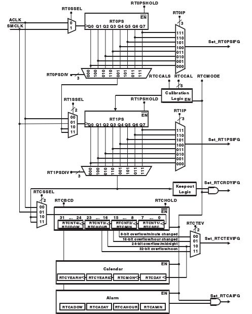 如图 ,RTC 由两个分频寄存器 RP0TS,RP1TS 对 RTOSSEL 选择的时钟源进行分频,在日历模式下,时钟源 ACLK=32768,经过 RP0TS,RP1TS 分别 256 和 128 分频率后频率为 1HZ ,提供给 32 位 RTC 寄存器时钟源,通过 RTCSSEL 选择 11 或者 10。每 1S ,RTCSEC(秒)加一秒,加到 60,秒从 0 开始计数,RTCMIN 加 1,RTCHOUR,RTCMON ,RTCYEAR ,RTCDOW(星期),RTCDAY等 依次这样。并且在日历模式下,RTC 可以设置为 BCD 码显示在存储器中。另外 RTC 提供闹钟功能,我们可以设置 Alarm 寄存器的 RTCAMIN ,RTCAHOUR,RTCADAY,RTCADOW(星期).另外 RTC 模块也可以作为 32 位计数器使用,其原理方法和 WDT,TA 一致。