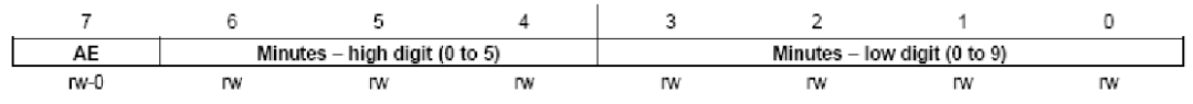 闹钟可以配置分钟,小时,星期,以分钟为例子时间设置完毕后,比如 08:23 分钟设置完毕后,将最高位为 AE 设置为 1,就会闹钟有效果,每个小时的第 23 分钟闹钟响。