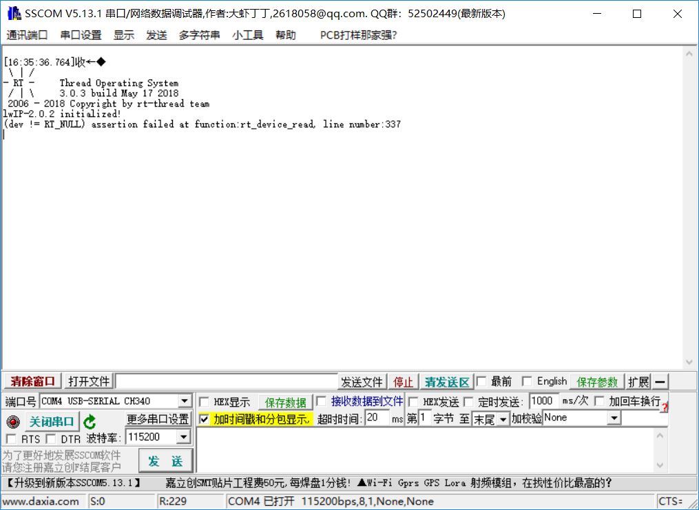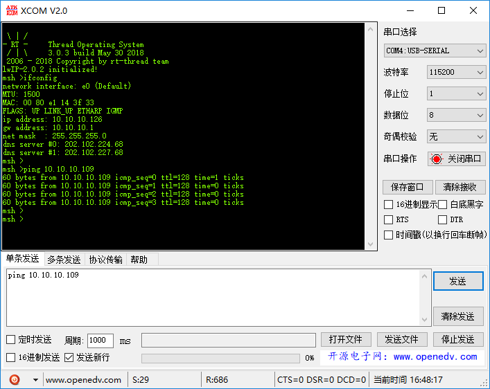 10.至此,所有配置完成,保存退出menuconfig,此时ENV开始自动下载ping工具包,使用pkgs --update更新包,完成后,使用 scons --target=mdk5 -s 命令生成工程。至此移植完成11.打开工程,直接编译,下载进开发板,打开串口助手,看好戏吧。对了,在开发板ping电脑的时候,要关闭电脑防火墙,不然ping不同。下图是成功现象: