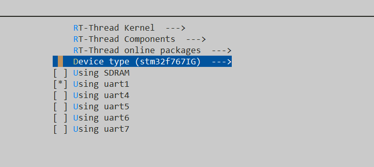 2.将bsp内stm32f429-apollo文件内drivers目录下的drv_eth.c/hdrv_i2c.c/h drv_pcf8574.c/h 这6个文件拷贝到stm32f767-apollo相应目录下。(cao! 步骤1中与此步骤有逻辑冲突,各位原谅我)3.现在开始修改各种配置吧,先用ENV工具menuconfig以下,注意看此时的配置图