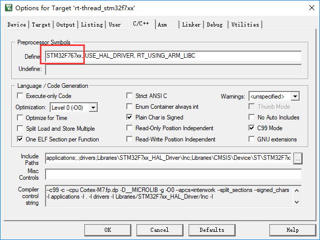 这样的话,生产工程时,会自动加载767的启动文件,并且在keil的C/C++预定义框中会自动定义STM32F767xx如下图所示: