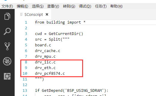 6.进入drivers子目录下,打开SConscript文件,这里说一下,3.0.3内的SConscript文件可以直接把该文件夹下所有源码加入工程,而这个最新的得自己加进去。修改如下: