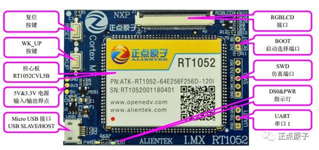 正点原子号令者RT1052开发板采用底板+核心板+转接板方式。核心板采用邮票孔接口,非常方便直接嵌入到用户产品。核心板通过转接板的B2B板对板接口连接底板,方便在底板上开发高级功能和学习。同时,核心板+转接板也可以单独使用,具有usb供电口,led灯,RGB液晶屏接口,,SDRAM,双FLASH以及按键等资源