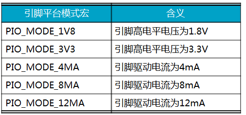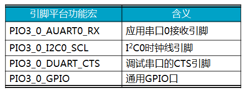 平台功能和模式与具体芯片相关,会随着芯片的不同而不同,主要包括引脚的复用功能和一些特殊的模式,平台功能和模式相关的宏定义在{chip}_pin.h文件中,宏名的格式为PIOx_y_*,比如:PIO3_0_AUART0_RX,即PIO3_0的串口0接收引脚。